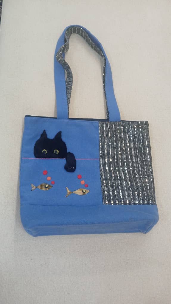 کیف توت بگ گودی با طرح گربه سیاه و ماهی سبک ژاپنی دوزی تمام دست دوز
