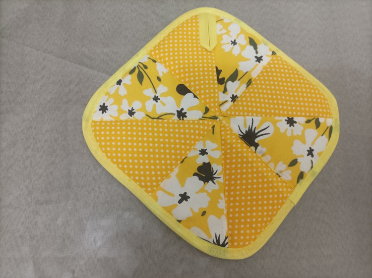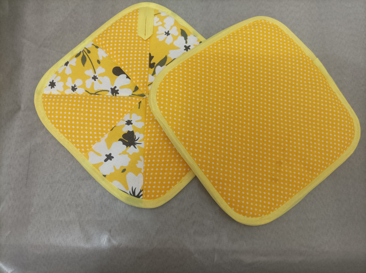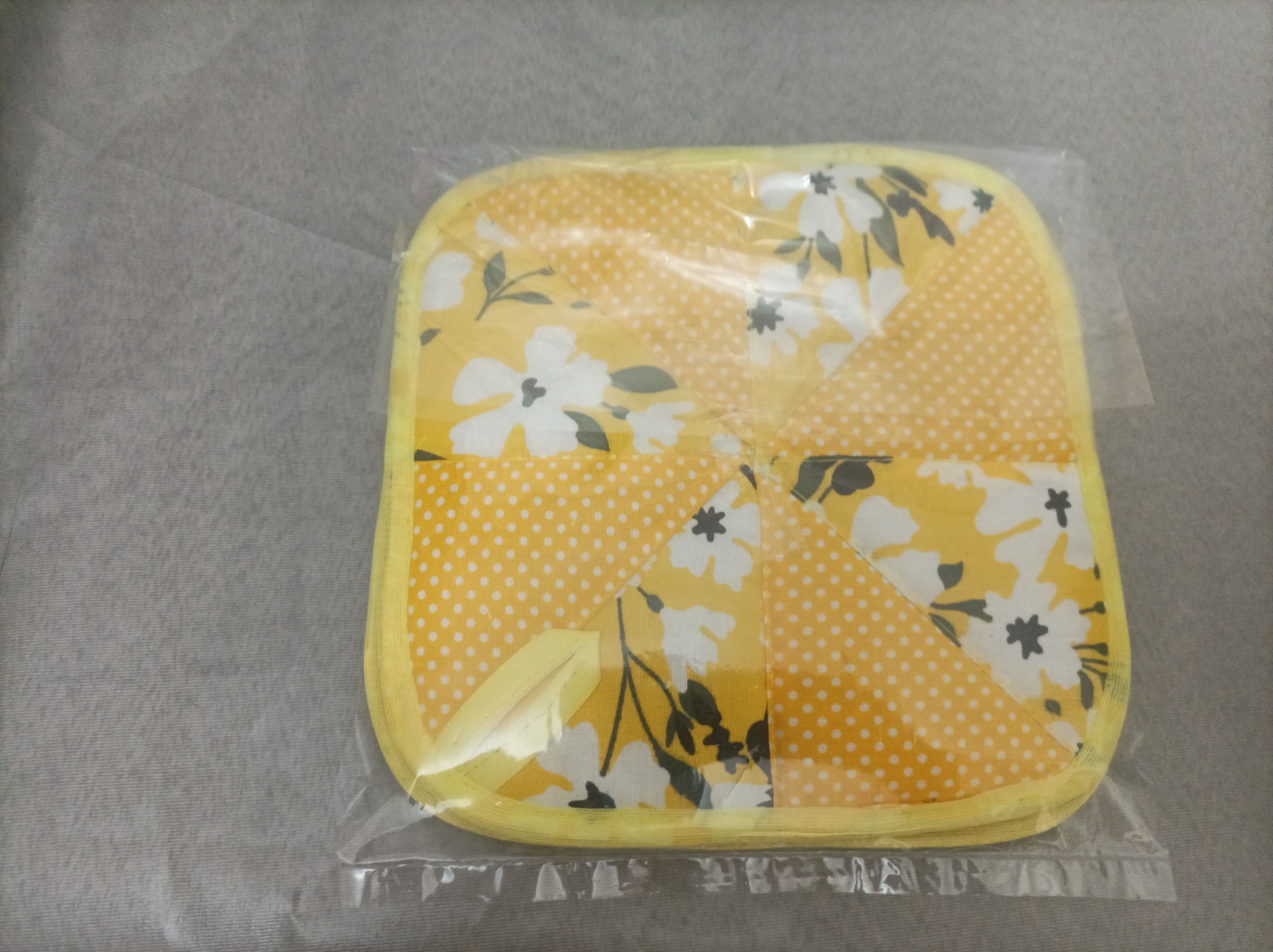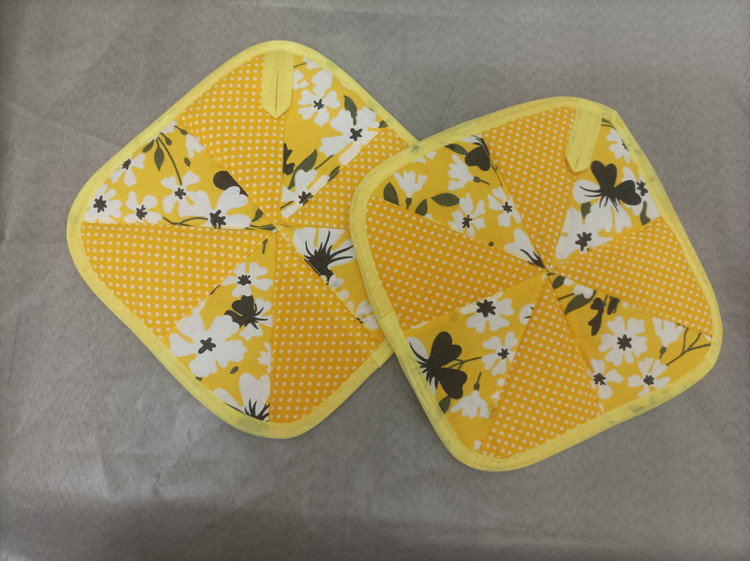 دستگیره فرفری ترکیب پارچه تترون نخ گلدار زرد و سفید و پارچه تترون نخ خالدار نوار اریب زرد رنگ پشم شیشه فیلتری 250گرم این محصول آماده هست به محض سفارش ارسال میشه