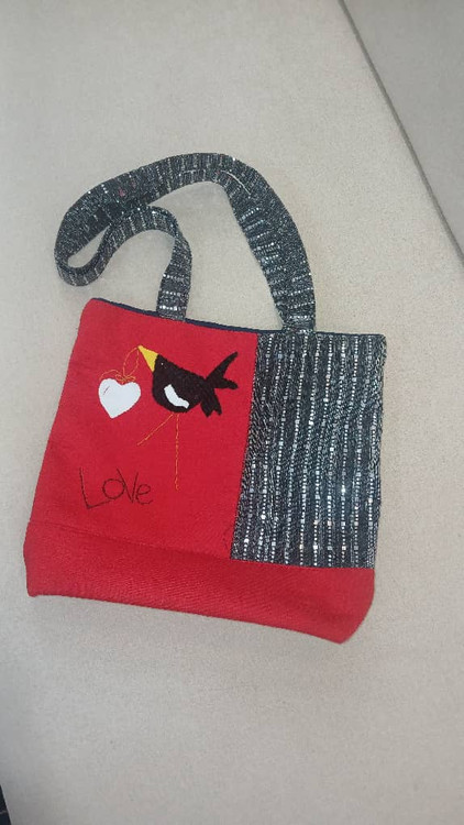 کیف توت بگ دو تکه پارچه زری براق مدادی با پارچه قرمز که روش طرح کلاغ عاشق هست که دوخت ژاپنی دوزی با دست انجام شده یک جیب داخل کیف هست آستر کشی ظریف